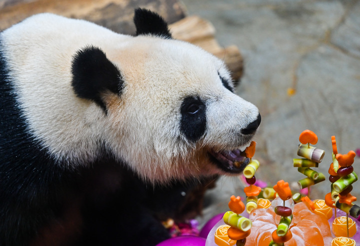 HAIKOU, 26. November 2023 (Xinhua) -- Der Riesenpanda Gonggong nimmt Nahrung im Hainan Tropical Wildlife Park and Botanical Garden in Haikou in der Provinz Hainan in Südchina zu sich, 25. November 2023. Seit ihrem ersten öffentlichen Auftritt vor fünf Jahren im Hainan Tropical Wildlife Park and Botanical Garden in 2018 leben die Riesenpandas Gonggong und Shunshun in Hainan. Am Samstag fand eine Festveranstaltung statt, die viele Besucher anzog. (Xinhua/Fan Yuqing)