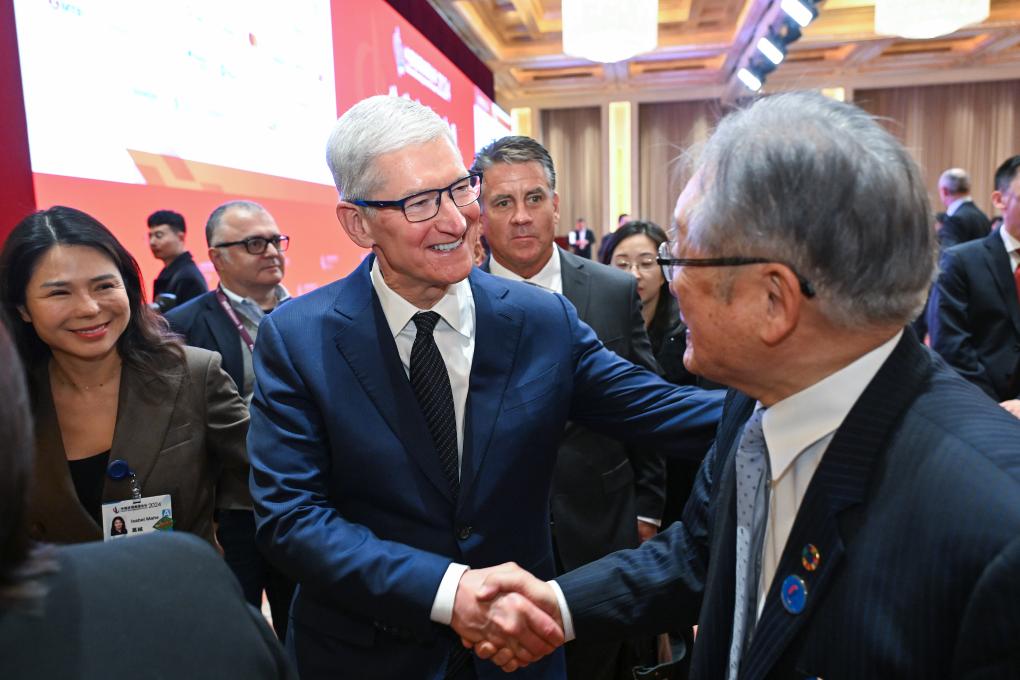 BEIJING, 24. März 2024 (Xinhuanet) -- CEO von Apple Tim Cook (M.) spricht mit einem Gast auf dem China Development Forum 2024 in Chinas Hauptstadt Beijing, 24. März 2024. Das China Development Forum 2024 soll vom 24. bis 25. März stattfinden. Das Thema des diesjährigen Forums lautet "Die kontinuierliche Entwicklung Chinas". (Quelle: Xinhua/Li Xin)