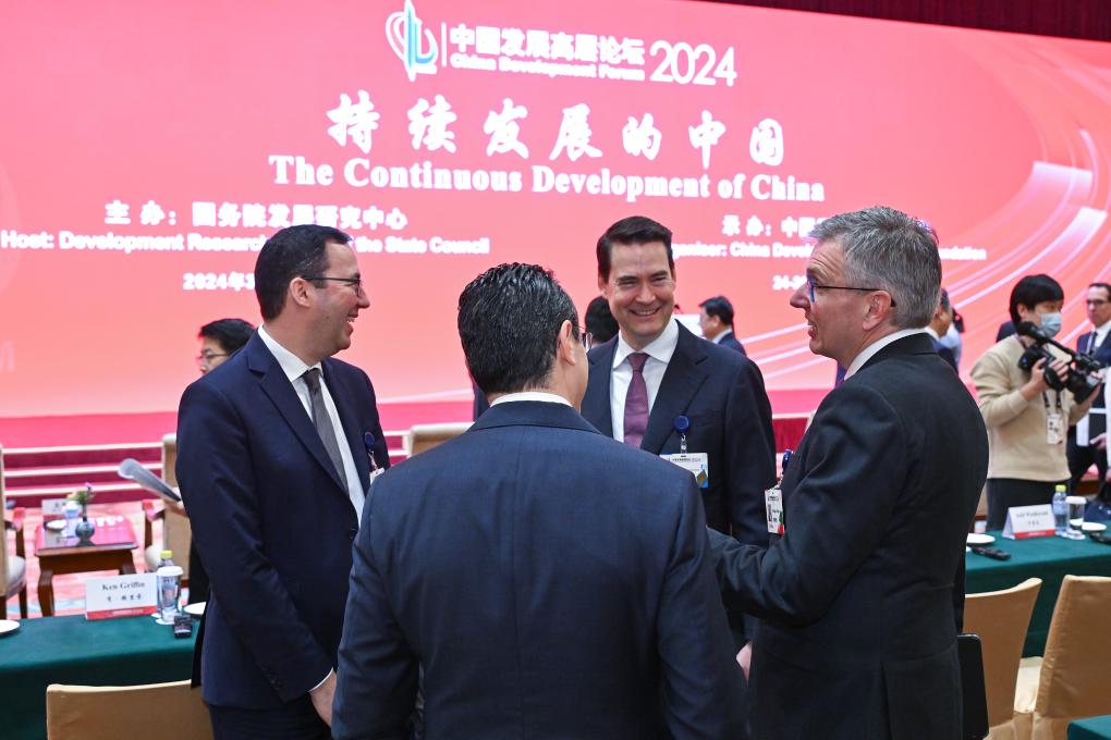 BEIJING, 24. März 2024 (Xinhuanet) -- Menschen unterhalten sich vor der Eröffnungszeremonie des China Development Forum 2024 in Chinas Hauptstadt Beijing, 24. März 2024. Das China Development Forum 2024 soll vom 24. bis 25. März stattfinden. Das Thema des diesjährigen Forums lautet "Die kontinuierliche Entwicklung Chinas". (Quelle: Xinhua/Li Xin)