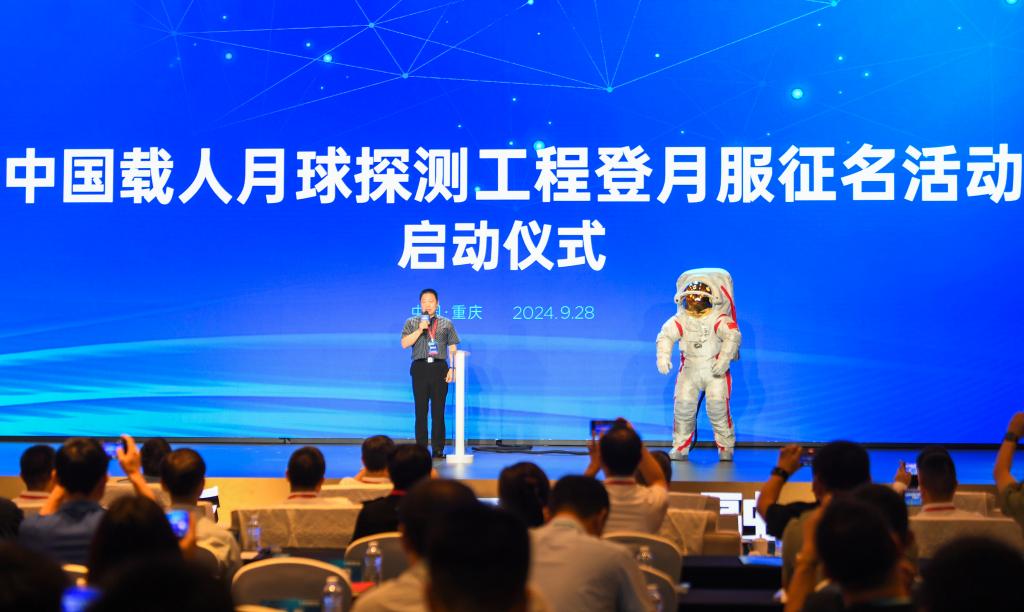 CHONGQING, 28. September 2024 (Xinhuanet) -- Das Foto zeigt die Zeremonie zum Start einer Aktivität zur Namensfindung für den chinesischen Raumanzug für die Mondlandung in der südwestchinesischen regierungsunmittelbaren Stadt Chongqing, 28. September 2024. Die Behörde für bemannte Raumfahrt in China hat am Samstag zum ersten Mal das äußerliche Design des Raumanzugs des Landes für die Mondlandung vorgestellt und von der Öffentlichkeit um den Namen gebeten. (Quelle: Xinhua/Wang Quanchao)