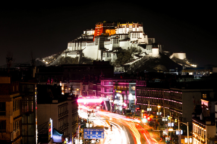BEIJING, 31. Dezember 2024 (Xinhua) -- Das Foto zeigt den nächtlichen Verkehrsfluss in Lhasa im Autonomen Gebiet Xizang im Südwesten Chinas, 5. Dezember 2024. (Xinhua/Zhang Long)