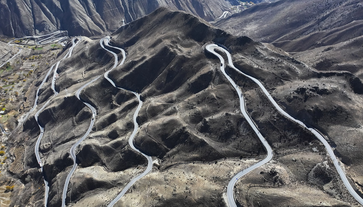 BEIJING, 31. Dezember 2024 (Xinhua) -- Die Luftaufnahme einer Drohne zeigt einen Teil der Serpentinen der Sichuan-Xizang-Schnellstraße am Nujiang-Fluss im Kreis Baxoi im Autonomen Gebiet Xizang im Südwesten Chinas, 16. November 2024. (Xinhua/Kelsang Namgyai)