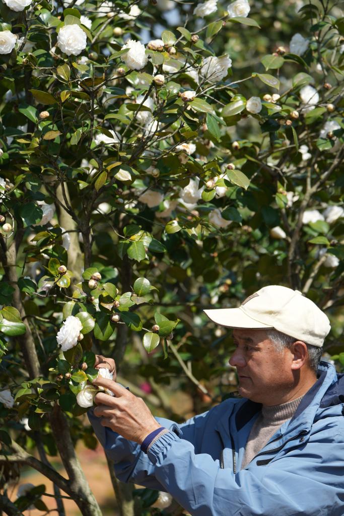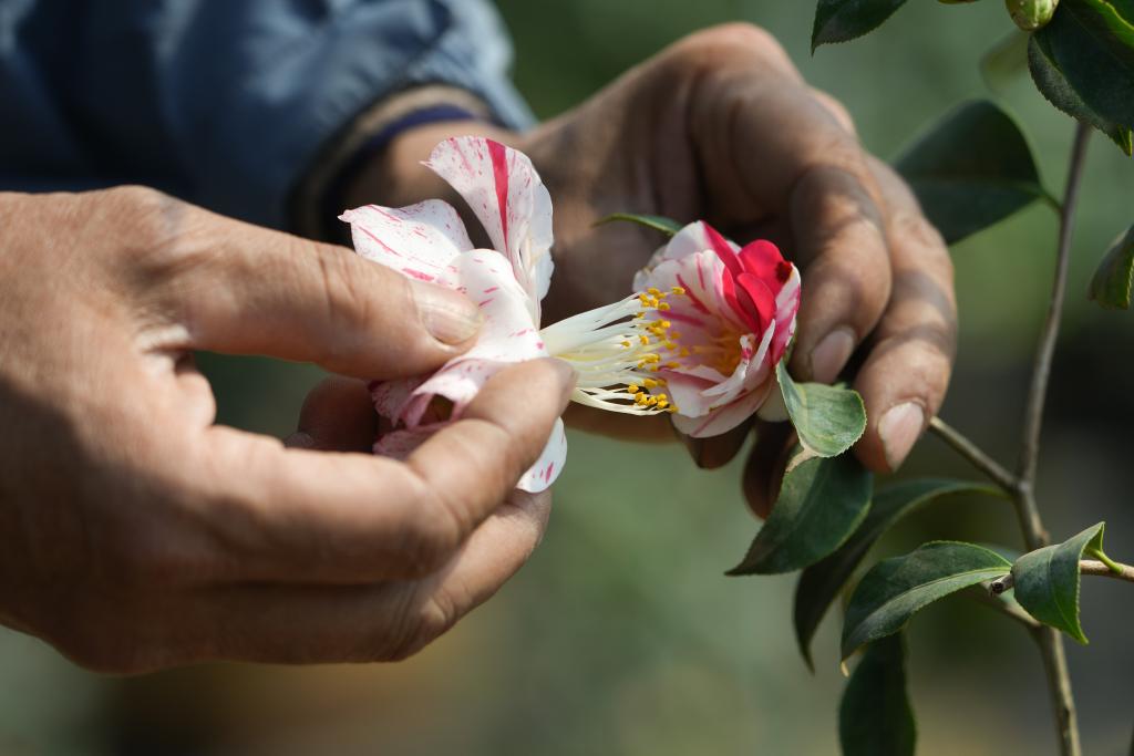 „Heute haben ausländische Kameliensorten große Anerkennung gefunden, aber China ist die wahre Heimat der Kamelie. Ich fühle mich verpflichtet, das Erbe weiterzugeben“, sagte Wang. (Quelle: Xinhua/Weng Xinyang)