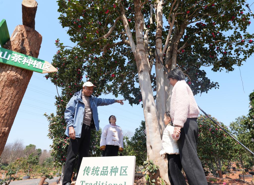 JINHUA, 18. März 2025 (Xinhuanet) -- Wang Zhengtuan (1. v. l.) zeigt Touristinnen einen Kamelienbaum in einer Anbaueinrichtung in der Gemeinde Zhuma in der Stadt Jinhua in der ostchinesischen Provinz Zhejiang, 18. März 2025. Zhuma, in China als „Heimat der Kamelie“ bekannt, ist auch die Heimat von Wang Zhengtuan, einem 57-jährigen Kamelienzüchter, der in der örtlichen Kameliengemeinschaft Anerkennung gefunden hat.