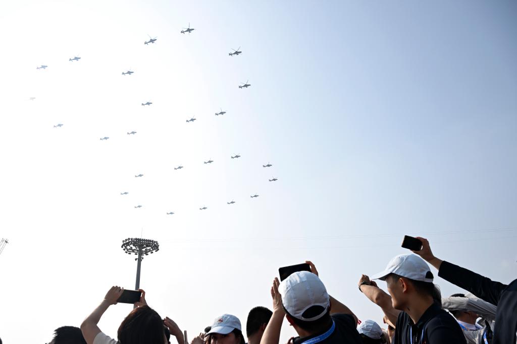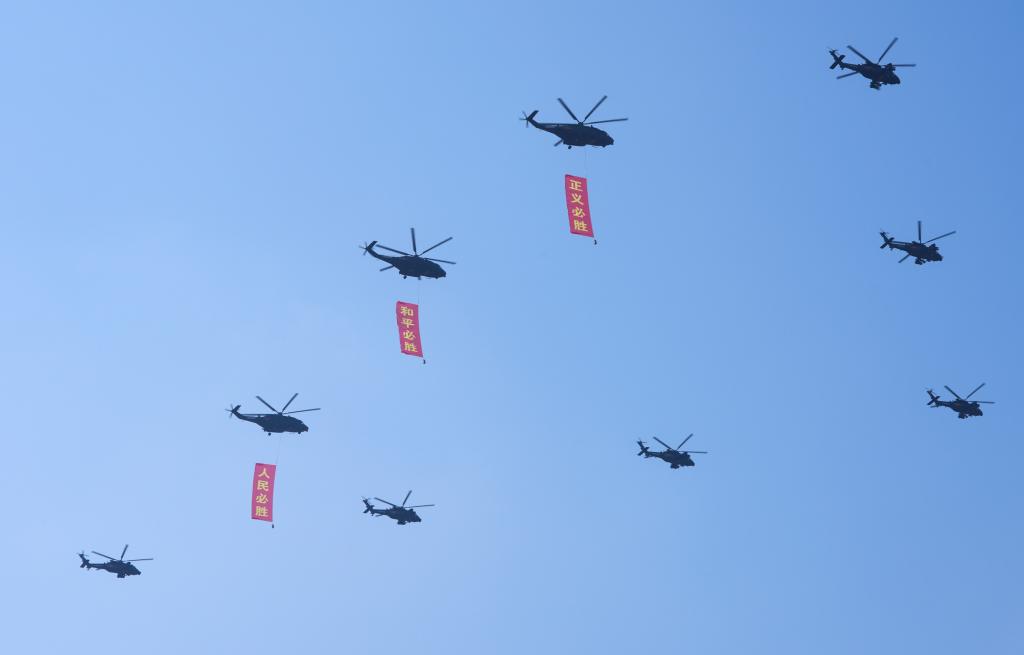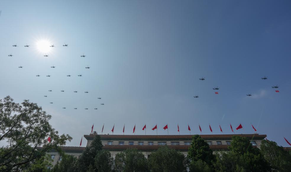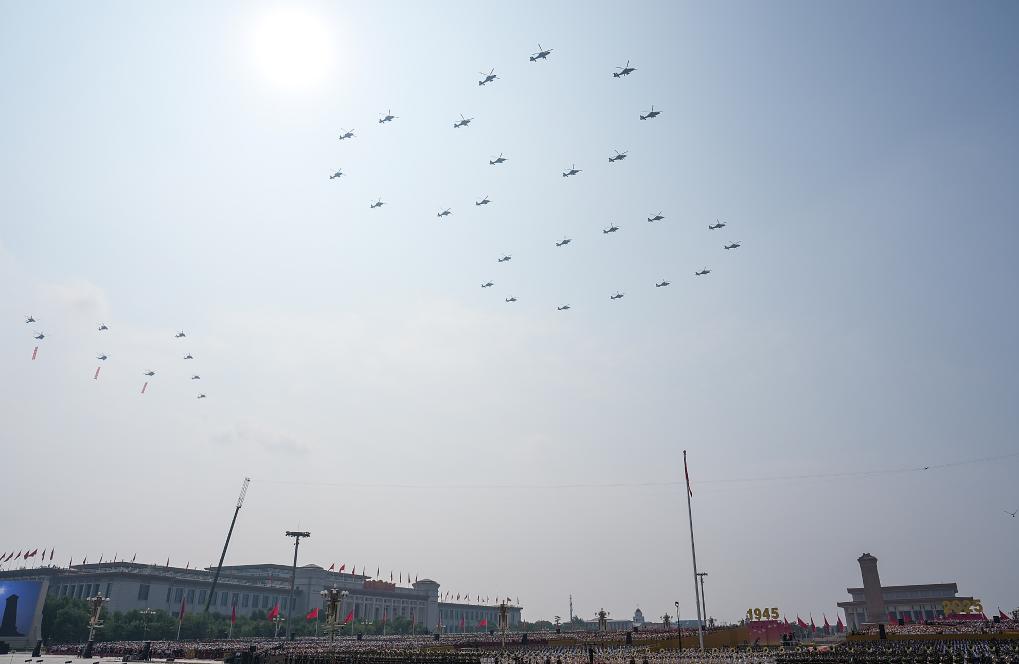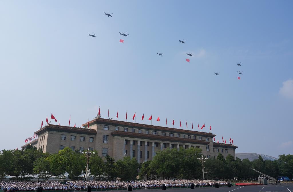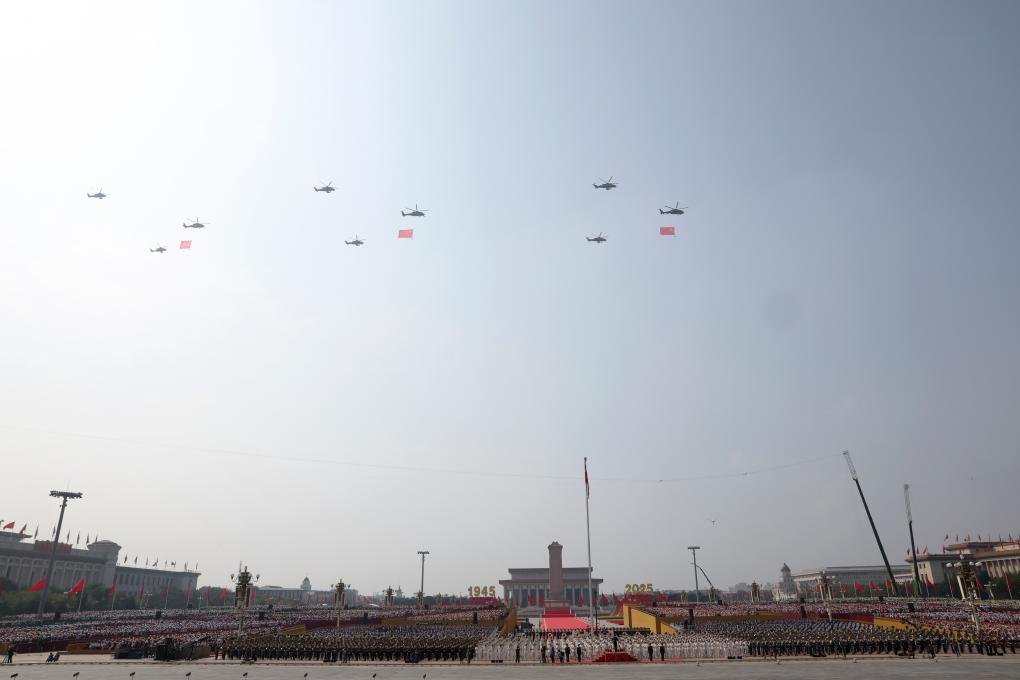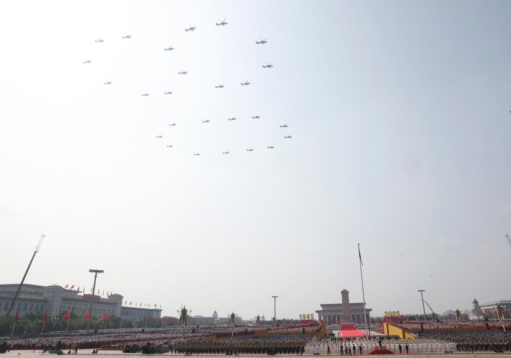 BEIJING, 3. September 2025 (Xinhuanet) -- Die Fahnenwache-Luftstaffel fliegt über den Tian'anmen-Platz während einer großen Versammlung zum Gedenken an den 80. Jahrestag des Sieges im Widerstandskrieg des chinesischen Volkes gegen die japanische Aggression und im weltweiten antifaschistischen Krieg in der chinesischen Hauptstadt Beijing, 3. September 2025. (Quelle: Xinhua/Yang Guanyu)