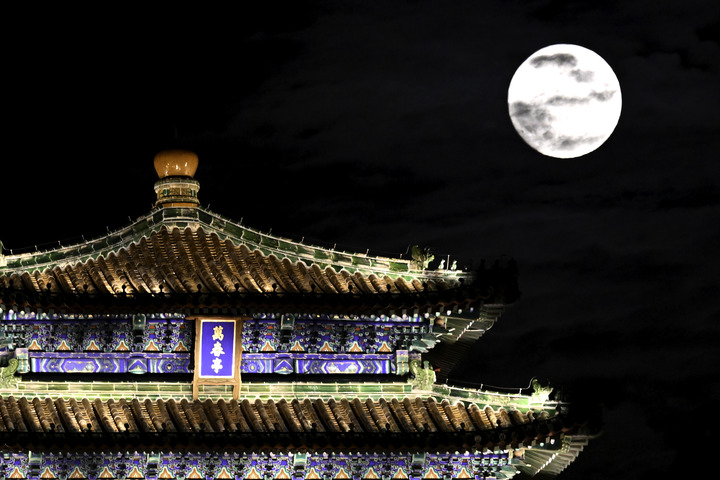 BEIJING, 7. Oktober 2025 (Xinhua) -- Das Foto zeigt den Vollmond in der Nähe des Palastmuseums in der chinesischen Hauptstadt Beijing, 6. Oktober 2025. Am Montag wurde das diesjährige Mondfest gefeiert, das jedes Jahr am 15. Tag des achten Monats des chinesischen Mondkalenders begangen wird. Menschen in ganz China bewundern den Vollmond, um den traditionellen Feiertag zu feiern. (Xinhua/Liu Jinhai)