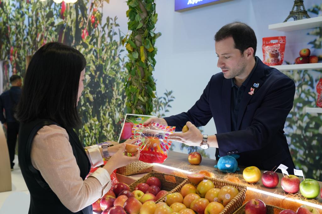 SHANGHAI, 7. November 2025 (Xinhuanet) -- Ein Aussteller (r.) präsentiert Äpfel aus Frankreich im Ausstellungsbereich für Lebensmittel und Agrarprodukte während der achten Internationalen Importmesse Chinas (CIIE) im ostchinesischen Shanghai, 7. November 2025. Auf der 8. CIIE wurden verschiedene ausländische Spezialitäten präsentiert. Viele Aussteller verarbeiten und bereiten Lebensmittel vor Ort zu, damit die Besucher sie probieren können. (Quelle: Xinhua/Liu Wenhui)