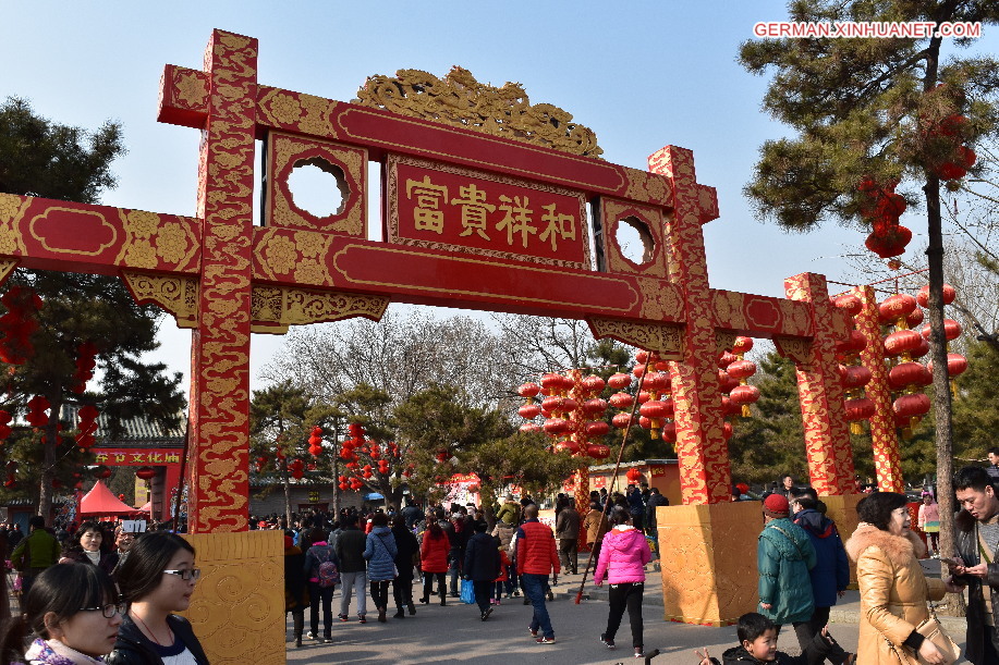 BEIJING, 12. Februar 2016 (Xinhuanet) -- Viele Menschen besuchen die Tempelmesse Ditan in Peking, 10. Februar 2016. Die 31. Tempelmesse Ditan wurde in Peking abgehalten, die vom 8. Februar bis 12. Februar (1. Januar bis 5. Januar nach Mondkalender) dauert. Bei der Tempelmesse werden viele Handwerke aussgestellt und verkauft, die viele Touristen anziehen. (Quelle: Xinhua)