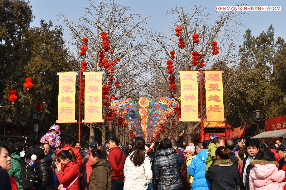 BEIJING, 12. Februar 2016 (Xinhuanet) -- Viele Menschen besuchen die Tempelmesse Ditan in Peking, 10. Februar 2016. Die 31.Tempelmesse Ditan wurde in Peking abgehalten, die vom 8. Februar bis 12. Februar (1. Januar bis 5. Januar nach Mondkalender) dauert. Bei der Tempelmesse werden viele Handwerke aussgestellt und verkauft, die viele Touristen anziehen. (Quelle: Xinhua)