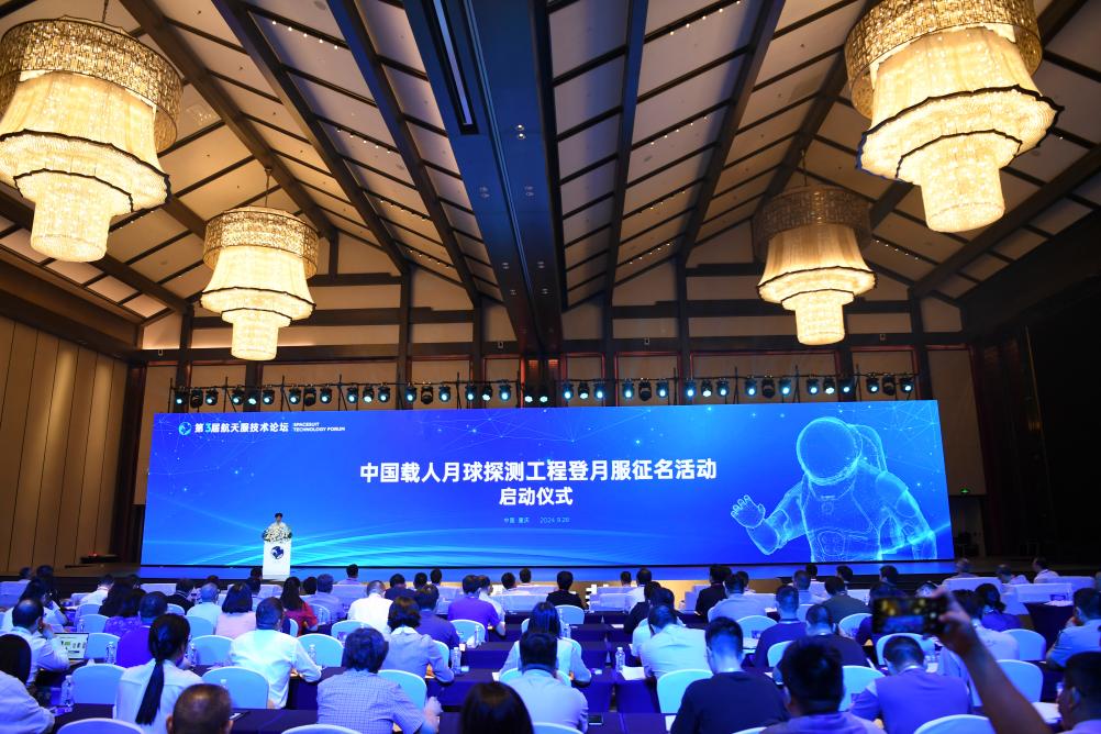 CHONGQING, 28. September 2024 (Xinhuanet) -- Das Foto zeigt die Zeremonie zum Start einer Aktivität zur Namensfindung für den chinesischen Raumanzug für die Mondlandung in der südwestchinesischen regierungsunmittelbaren Stadt Chongqing, 28. September 2024. Die Behörde für bemannte Raumfahrt in China hat am Samstag zum ersten Mal das äußerliche Design des Raumanzugs des Landes für die Mondlandung vorgestellt und von der Öffentlichkeit um den Namen gebeten. (Quelle: Xinhua/Wang Quanchao)