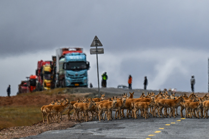 BEIJING, 31. Dezember 2024 (Xinhua) -- Tibet-Antilopen überqueren die Qinghai-Xizang-Schnellstraße in Hoh Xil in der Provinz Qinghai im Nordwesten Chinas, 27. Mai 2024. (Xinhua/Zhang Long)
