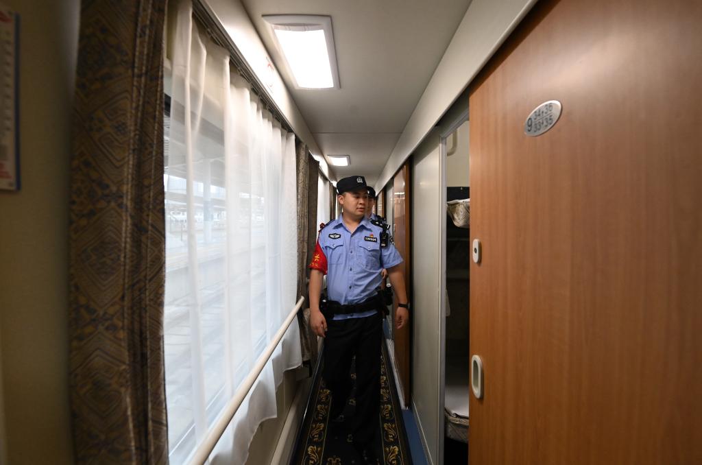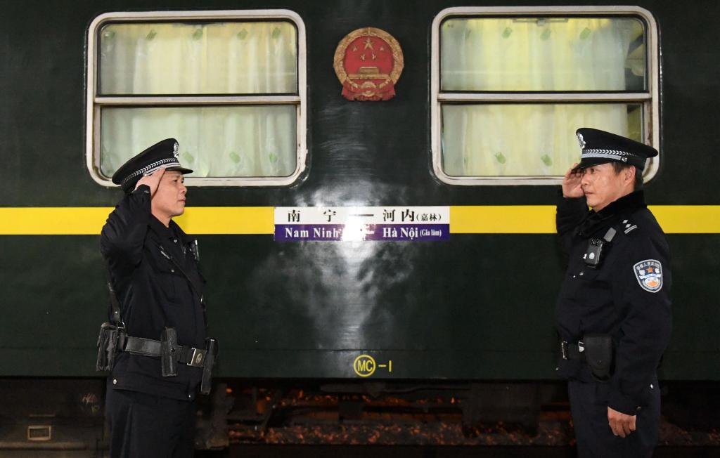 NANNING, 26. Mai 2025 (Xinhuanet) -- Wang Rongxin (vorne), ein Bahnpolizist der Zweigstelle Nanning des Büros für öffentliche Sicherheit der Bahn in Nanning, ist mit seinem Kollegen in einem Zug nach Hanoi an einem Bahnhof in Nanning im südchinesischen Autonomen Gebiet Guangxi der Zhuang im Einsatz, 25. Mai 2025. Der Zug T8701 verließ Nanning, die Hauptstadt des südchinesischen Autonomen Gebiets Guangxi der Zhuang, am 25. Mai um 18.05 Uhr in Richtung Hanoi, Vietnam, was die Wiederaufnahme des internationalen Schienenpersonenverkehrs zwischen China und Vietnam nach fünfjähriger Unterbrechung markierte. (Quelle: Xinhua/Lu Boan)