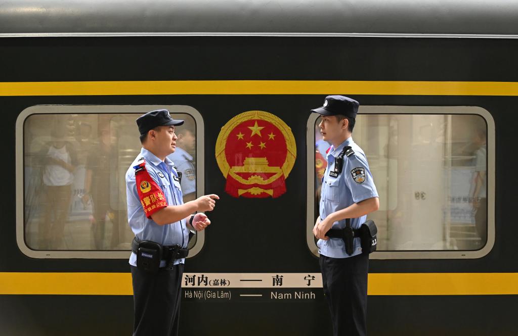 NANNING, 26. Mai 2025 (Xinhuanet) -- He Jianlin (l.), ein Beamter der Bahnpolizei der Zweigstelle Nanning des Büros für öffentliche Sicherheit der Bahn in Nanning, kommuniziert mit seinem Kollegen Wang Rongxin vor einem Zug nach Hanoi an einem Bahnhof in Nanning im südchinesischen Autonomen Gebiet Guangxi der Zhuang, 25. Mai 2025. (Quelle: Xinhua/Lu Boan)
