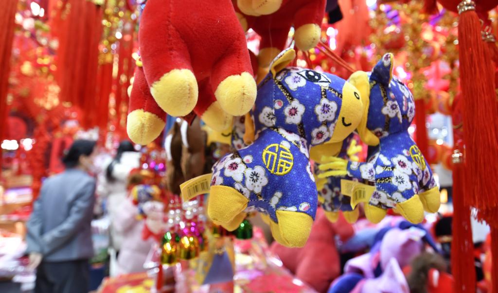 BEIJING, 1. Februar 2026 (Xinhuanet) -- Menschen kaufen festliche Dekorationen in einem Einkaufszentrum in Chinas Hauptstadt Beijing, 31. Januar 2026. Mit dem Herannahen des Frühlingsfestes haben Einkaufszentren in ganz Beijing mit dem Verkauf von festlichen Dekorationen begonnen. (Quelle: Xinhua/Li Xin)