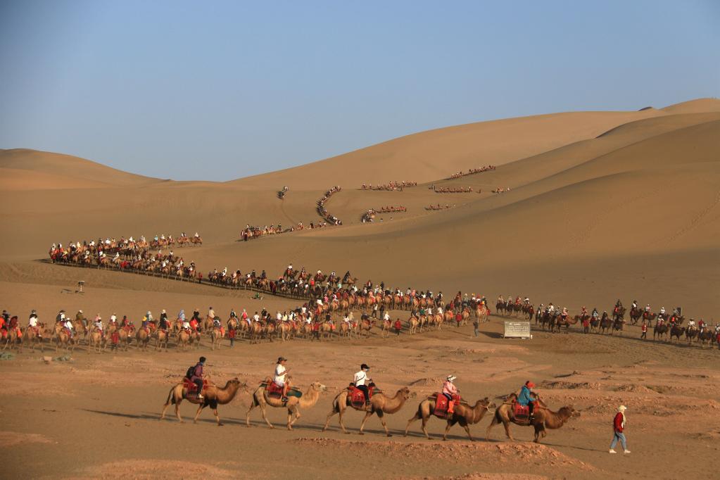 初秋時節,甘肅省敦煌市碧空如洗,鳴沙山月牙泉景區景色如畫,引人入勝。