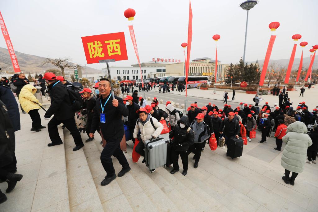 2月19日,甘肅省定西市在寶蘭高鐵甘肅定西北站站前廣場舉行返崗務工人員出發儀式。新華社發(王克賢攝)