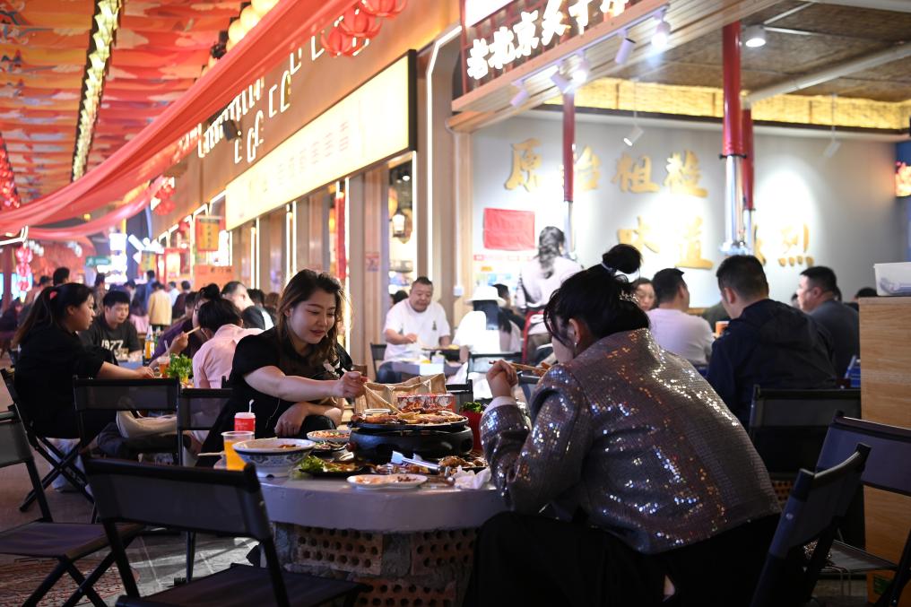 4月26日,游客在位於蘭州市城關區的黃河食渡文旅美食街品嘗美食。新華社記者 范培珅 攝