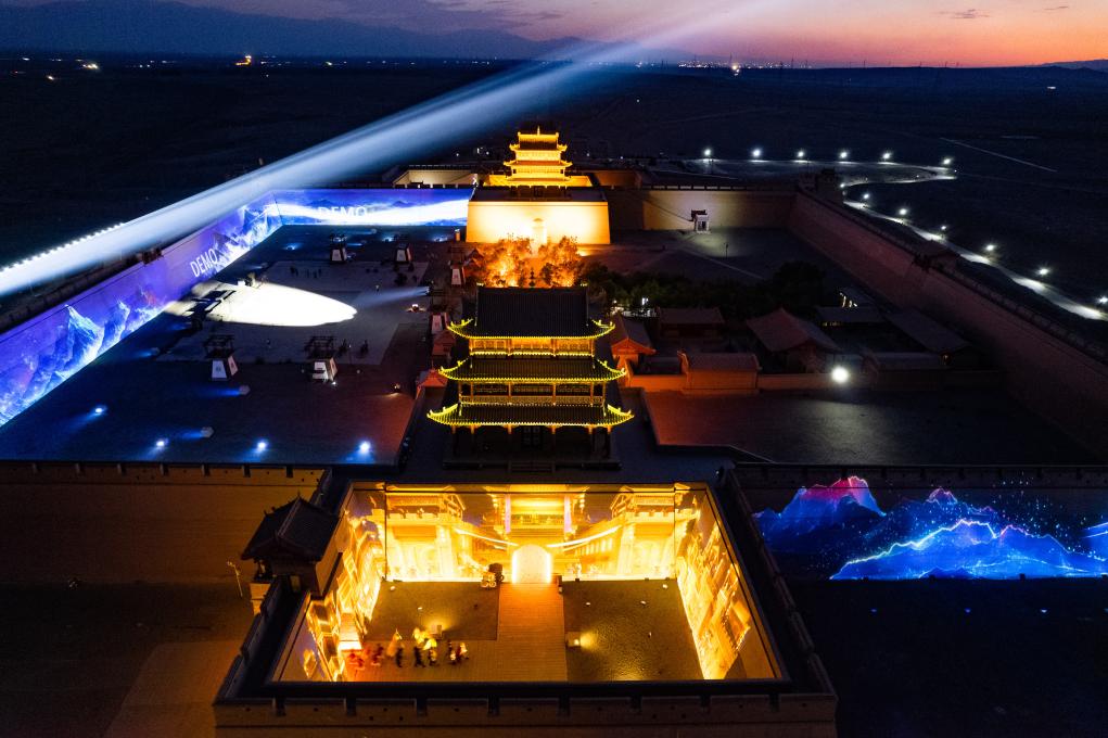 7月14日晚在甘肅省嘉峪關市嘉峪關關城景區拍攝的夜游燈光劇《天下嘉峪關》光影效果(無人機照片)。新華社記者 郎兵兵 攝
