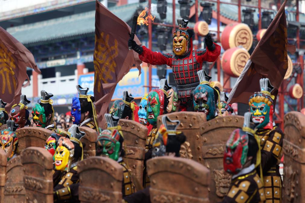 1月30日,演員在蘭州市2025年春節文化廟會活動現場表演西固軍儺舞。新華社記者 陳斌 攝