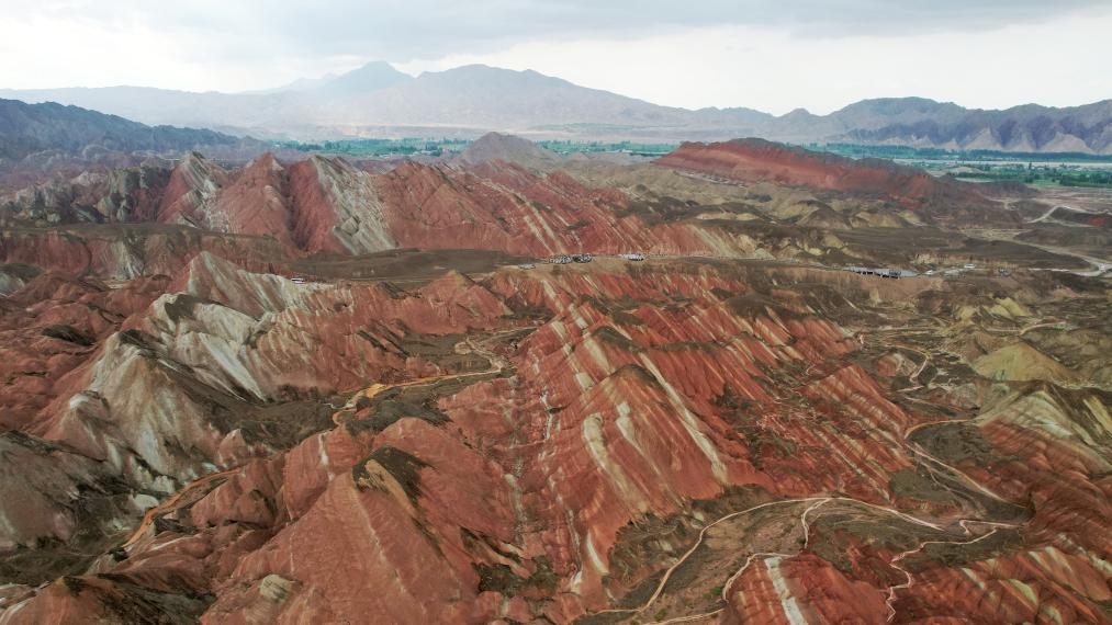 游客在張掖市七彩丹霞景區觀賞雨中丹霞(6月22日攝,無人機照片)。新華社記者 陳斌 攝