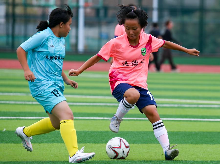 河南省運之傑足球俱樂部球員崔夢潔(右)和來自甘肅省蘭州市第十一中學代表隊球員沈櫻寧在U13女子組比賽中拼搶。新華社記者郎兵兵攝