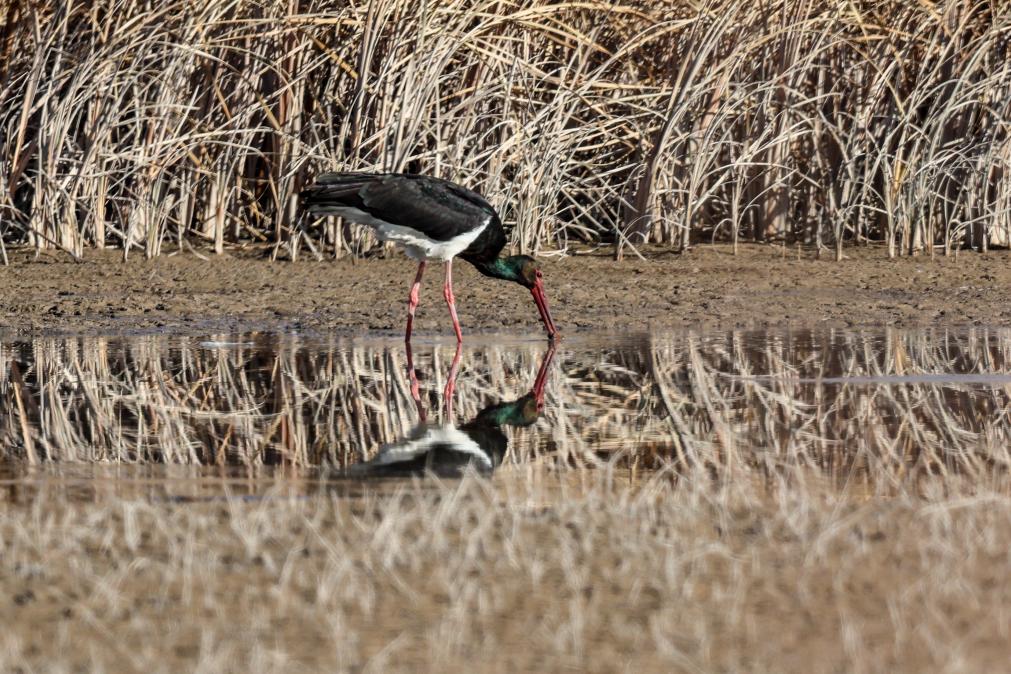 11月12日,黑鸛在張掖黑河濕地國家級自然保護區高&段一處濕地淺灘覓食。新華社記者 郎兵兵 攝