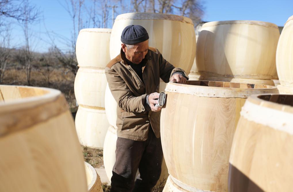 11月27日,手工藝人周天成給牛皮鼓刷清漆。新華社發(王克賢 攝)