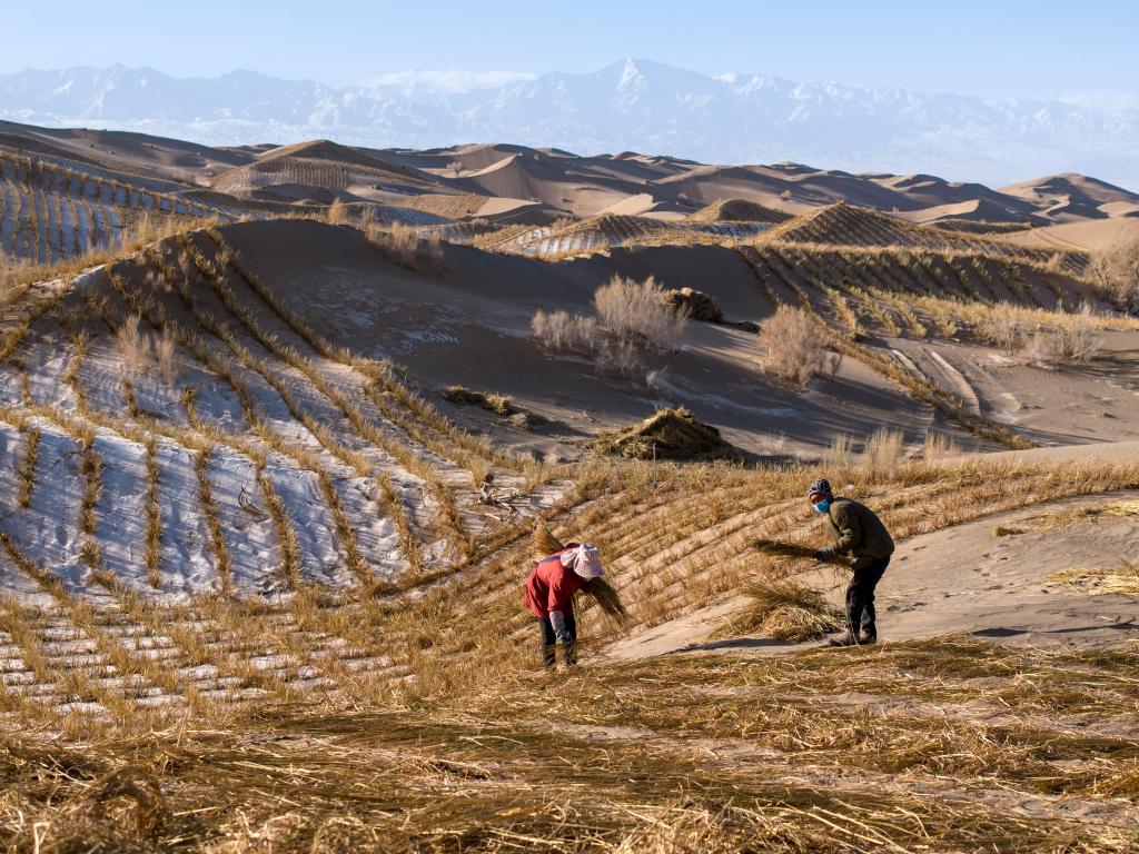 一場冬雪過後,在甘肅省酒泉市阿克塞哈薩克族自治縣的庫姆塔格沙漠邊緣,施工人員忙着鋪設沙障,有序推進甘肅省酒泉市祁連山北麓阿克塞片區水源涵養與生態保護修復項目。該項目總規模22.2萬畝,包括工程固沙、封灘(沙)育林、人工造灌木林等防沙治沙項目。