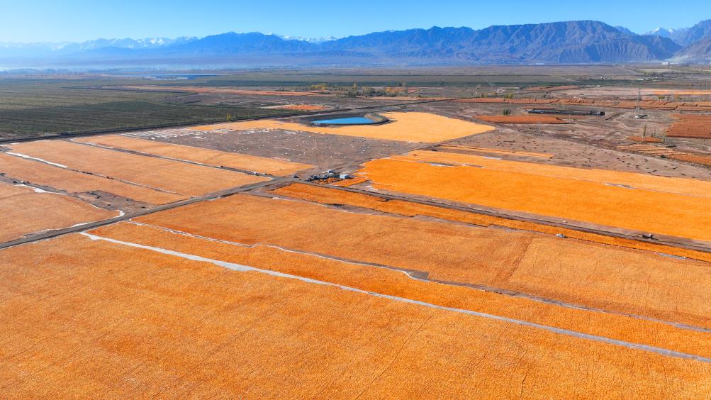 這是2025年10月13日在甘肅省張掖市甘州區一處荒灘拍攝的玉米種子曬場(無人機照片)。新華社發(李自海攝)