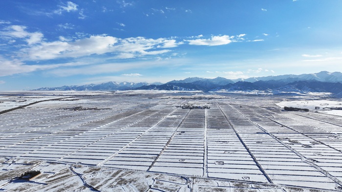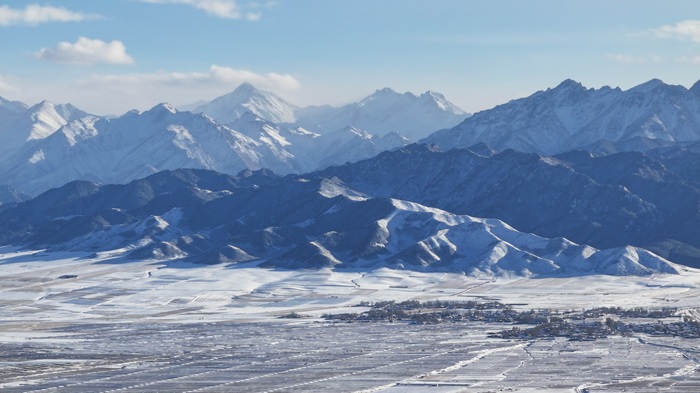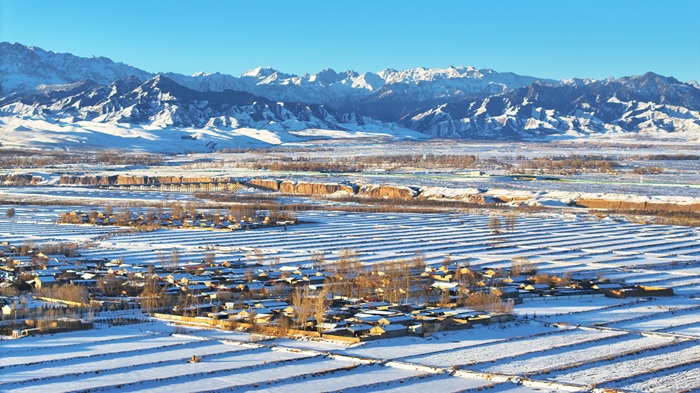 1月12日,壯麗的祁連山下的民樂縣,呈現出沃野良田阡陌縱橫萬畝相連的美麗畫卷。(王曉涇 喇勇)
