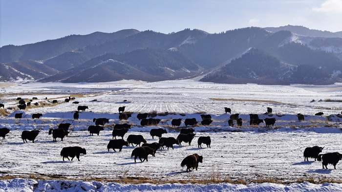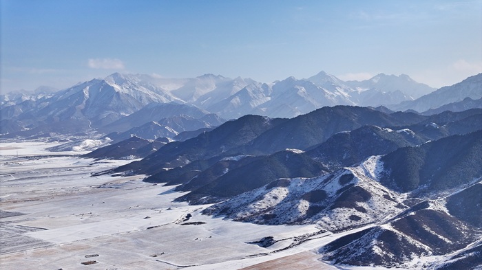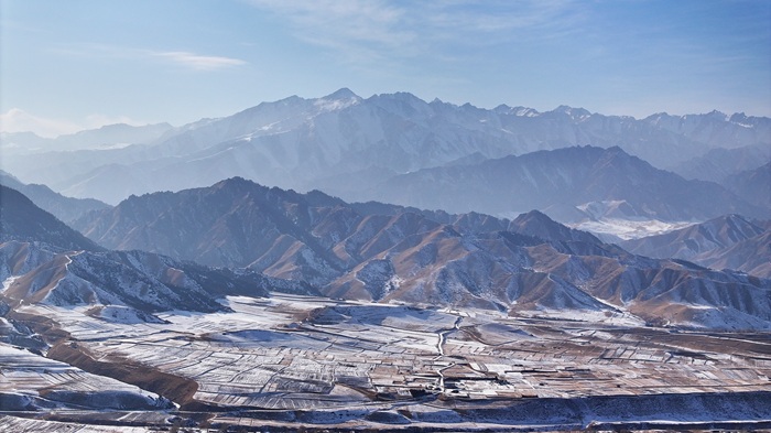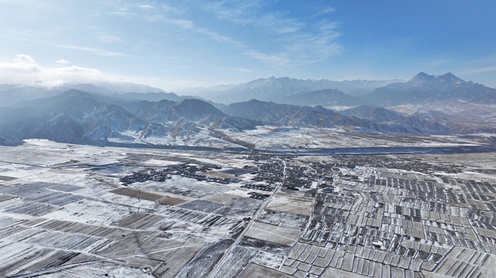 近日,一場初雪過後,在甘肅省張掖市民樂縣境內,連綿起伏的祁連山脈被皚皚白雪覆蓋,層巒疊嶂宛如朵朵“浪花”。山腳下,田野與村莊錯落分佈,牛羊在覆雪的田地上悠然覓食,一幅雄渾壯美的水墨畫卷在天地間鋪展開來。(王曉涇)