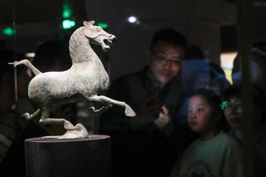 1月26日晚,在甘肅省博物館二樓絲綢之路文明展廳,觀眾觀看銅奔馬(複製品)。新華社記者 郎兵兵 攝