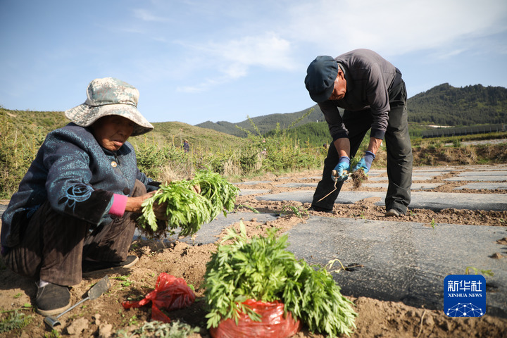 這是5月23日在渭源縣田家河鄉元古堆村拍攝的種植萬壽菊場景。新華社記者 馬希平 攝