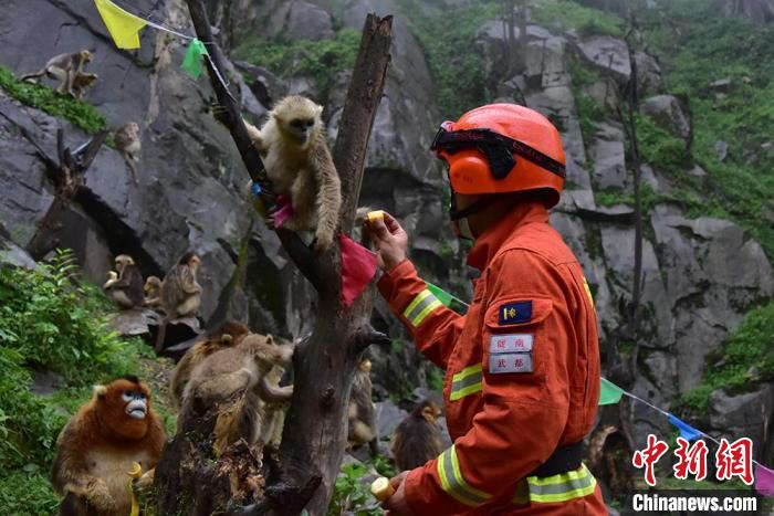 圖為消防員投喂國家一級保護動物川金絲猴。 王琨 攝