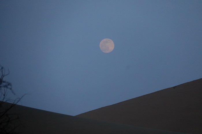 這是2023年2月5日晚在鳴沙山月牙泉景區拍攝的月亮。