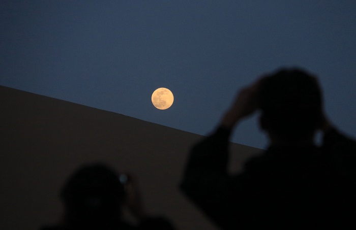 2023年2月5日晚,游客在鳴沙山月牙泉景區賞月。