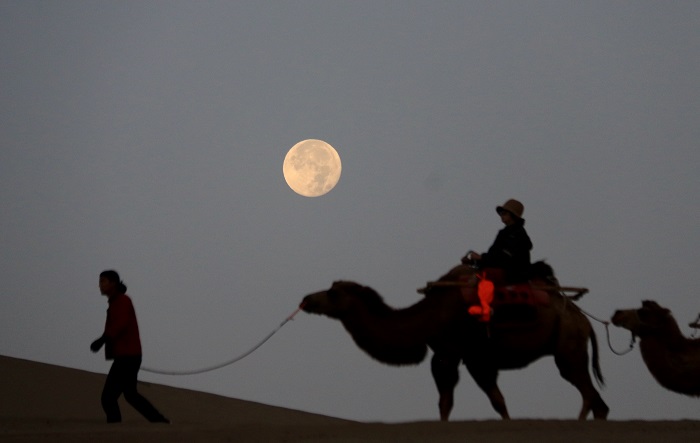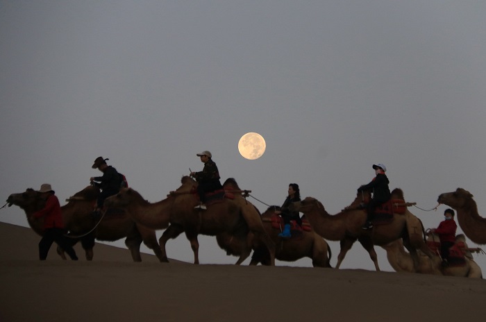 9月1日清晨,一輪明月懸挂在甘肅省敦煌市鳴沙山月牙泉景區上空,分外皎潔、美麗迷人。游人在景區欣賞大漠明月,領略瀚海風光,體驗絲路風情。