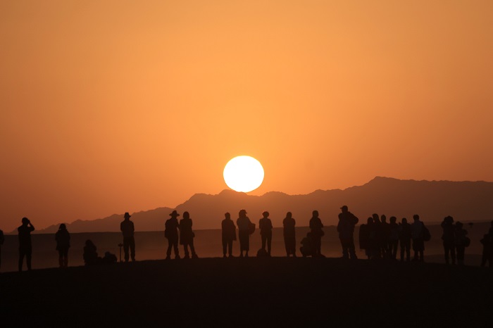 2023年9月11日清晨,游客在甘肅省敦煌市鳴沙山月牙泉景區觀賞日出。張曉亮 攝