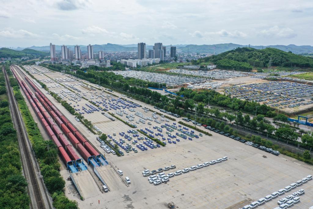 這是位於廣西柳州市的雒容汽車物流基地,一些出口的新能源汽車從這裡裝車運往各大出海港口(7月19日攝,無人機照片)。