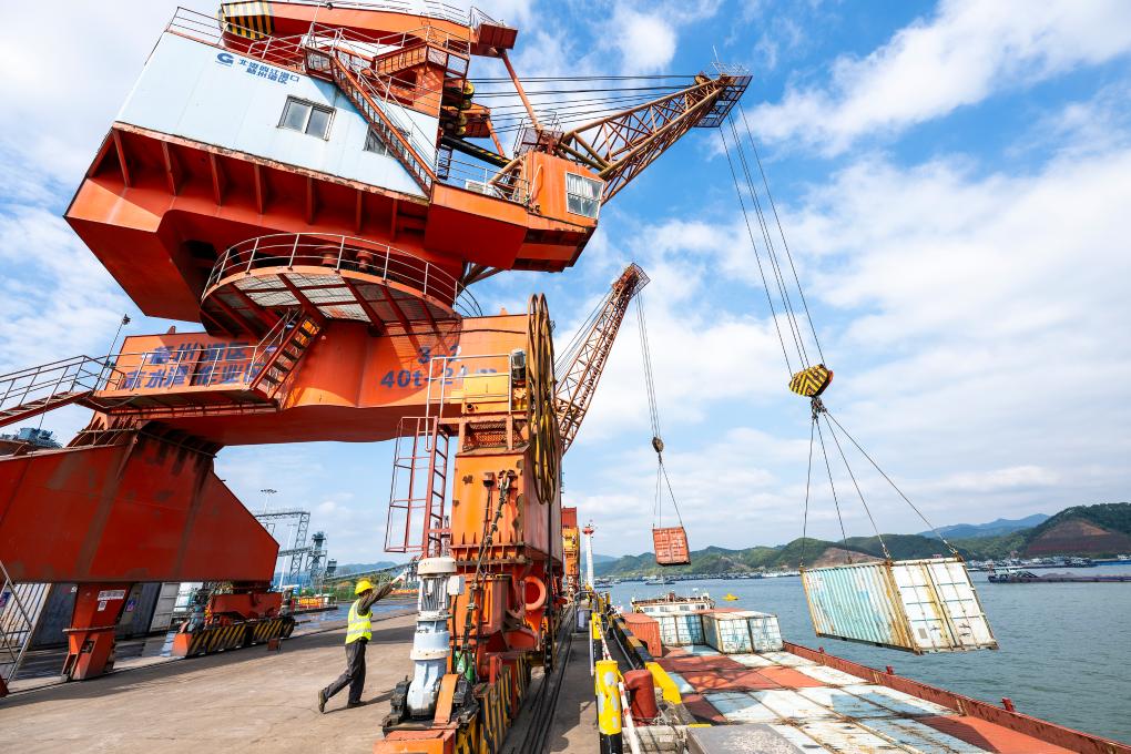 1月3日,在廣西梧州臨港經濟區赤水港碼頭,工人操作設備在碼頭上進行裝卸作業。