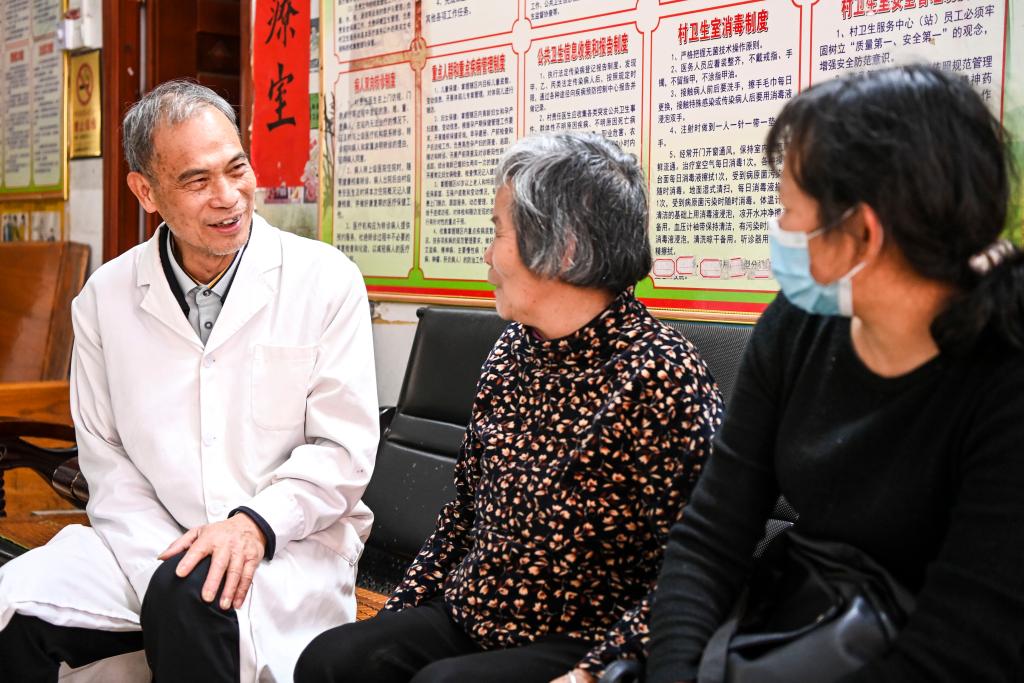 2月20日,在廣西興業縣石南鎮環江村衞生室,梁柱明(左一)與前來就診的村民交流。