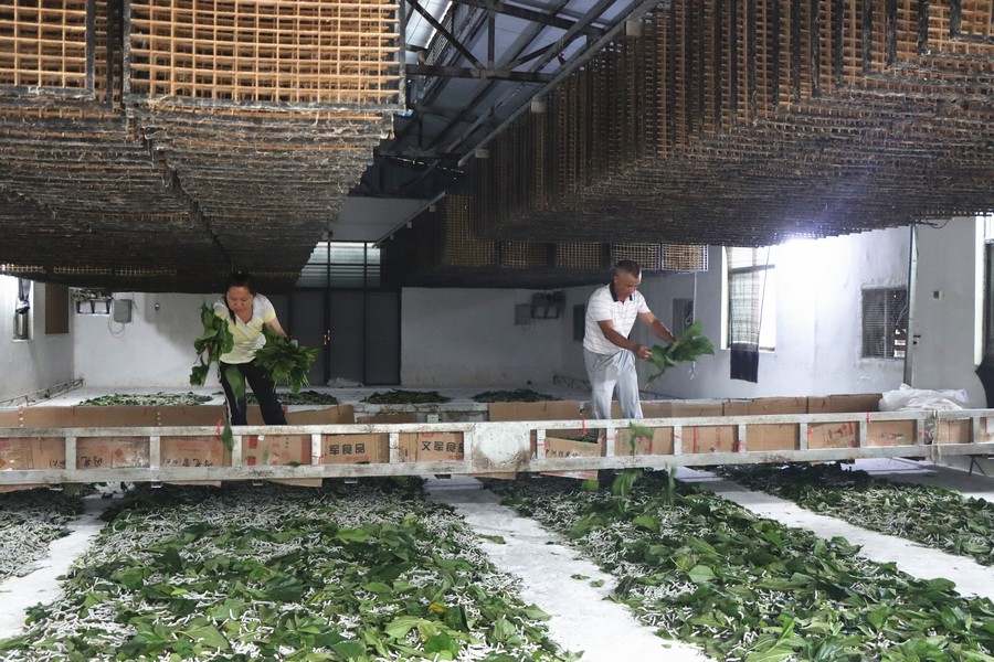 在忻城縣紅渡鎮六納村標準化桑蠶生産示範基地,工人正在給蠶蟲喂桑葉。(藍春青 攝)