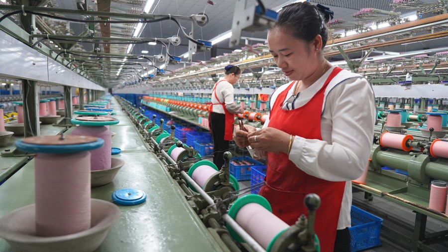 在忻城繭絲綢産業園項目生産車間內,工人們正在進行倒筒作業。 (藍春青 攝)