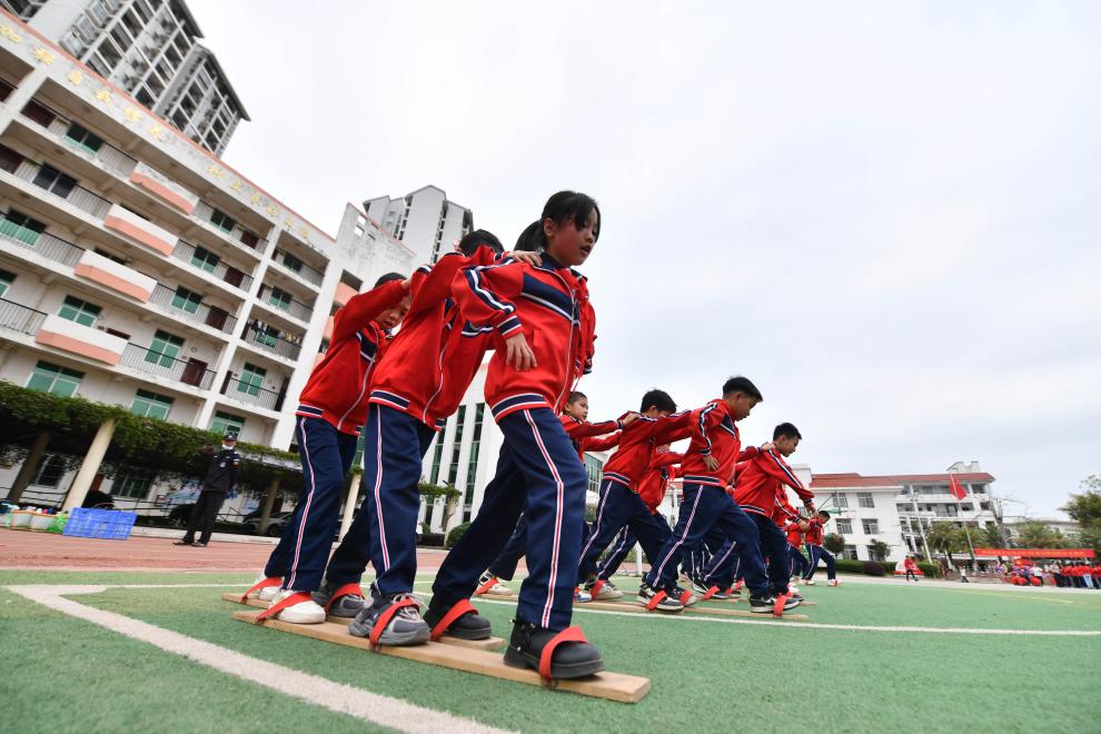 在梧州市長洲區龍平小學,學生們在陽光大課間進行板鞋練習(2024年3月26日攝)。