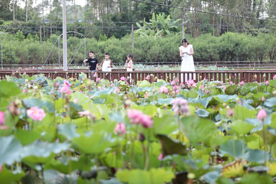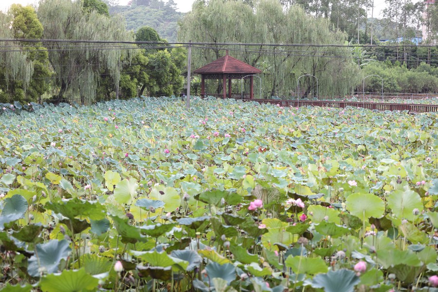 近日,廣西玉林市容縣容西鎮祖立村龍南公園的荷花迎來了盛開期,為炎炎夏日增添了一抹清新與詩意,吸引了不少市民前來觀賞。