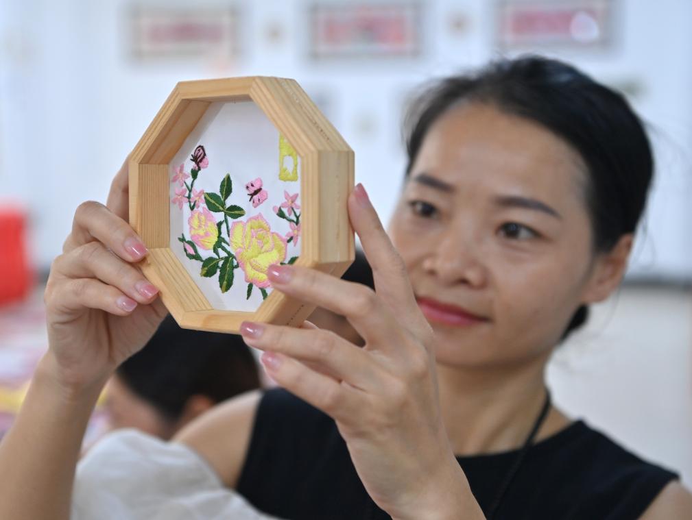 凌漫麗在田東縣義圩鎮七里刺繡基地展示她和村民製作的工藝品(8月20日攝)。
