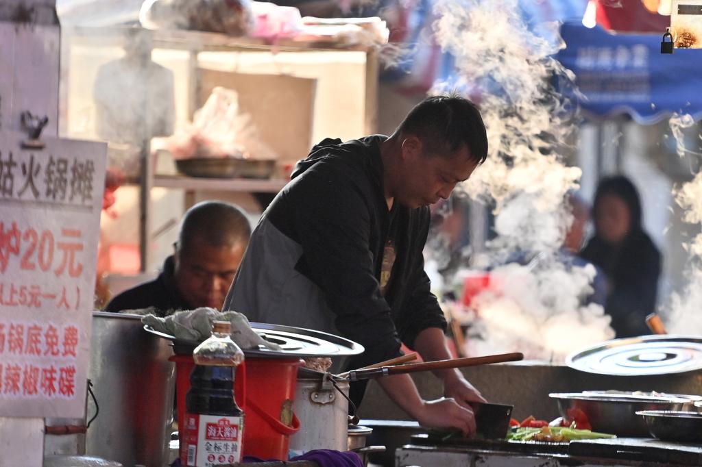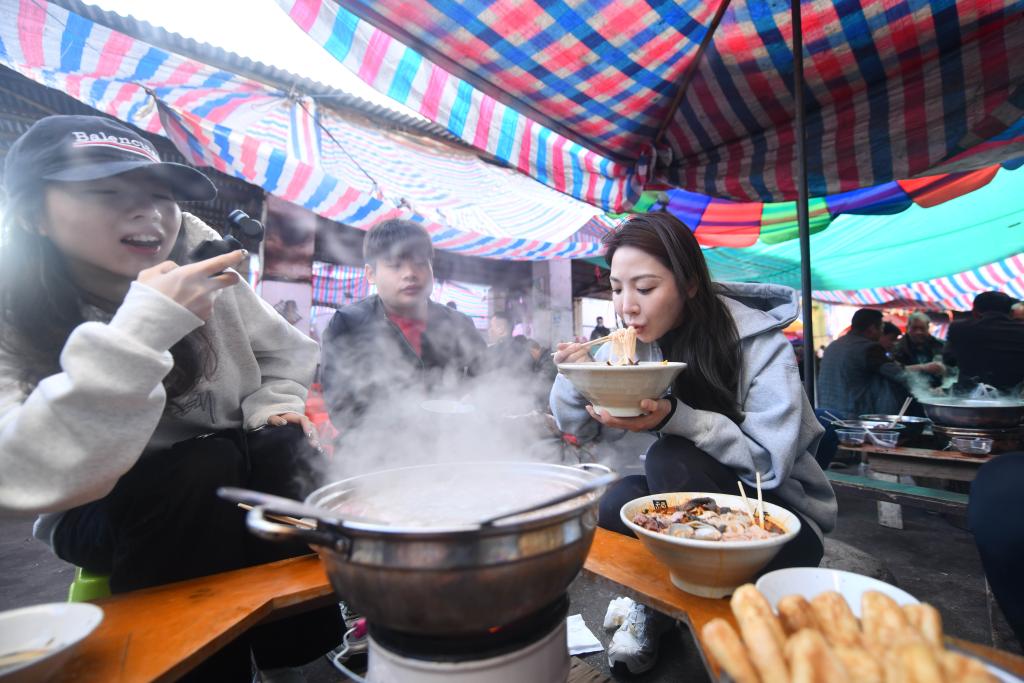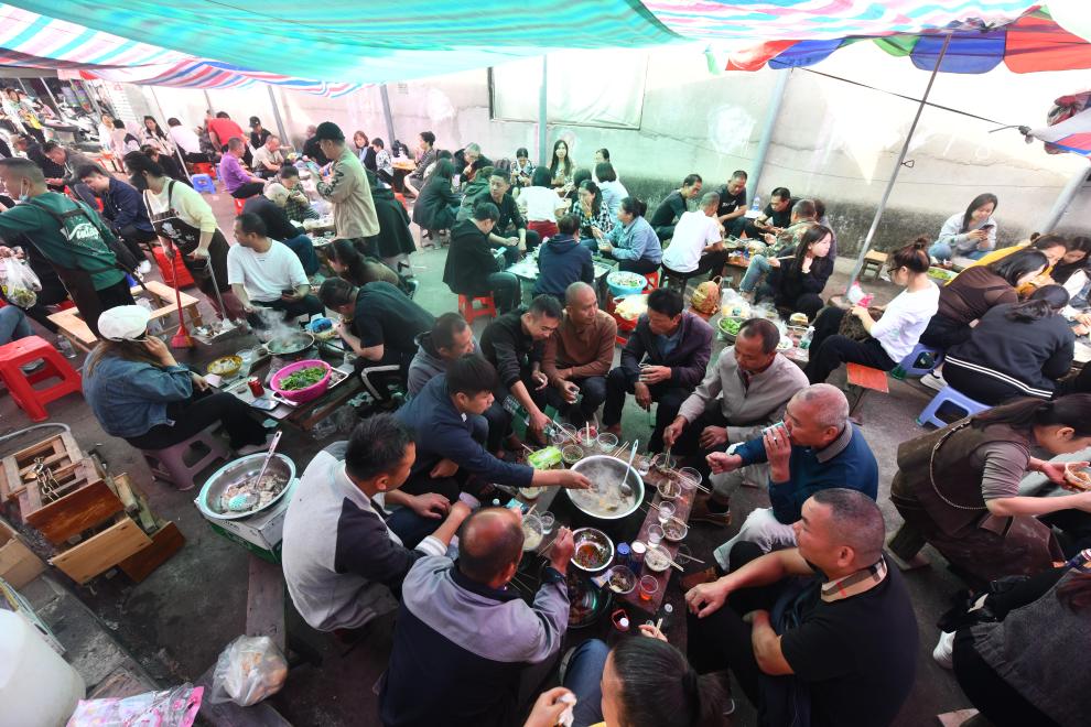 小煤爐火鍋、簡易的桌椅、現切的新鮮食材,大家圍爐而坐,互相聊着家長裏短,歡聲笑語間如共進鄰里百家宴……因其獨有的煙火氣和濃濃的人情味,成團鎮早市走紅網絡,吸引越來越多市民和游客前來打卡,體驗別具風格的鄉村早市文化。