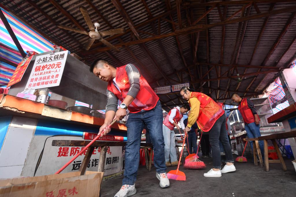 在柳州市柳江區成團鎮農貿市場早市,志願者在打掃衞生(11月19日攝)。