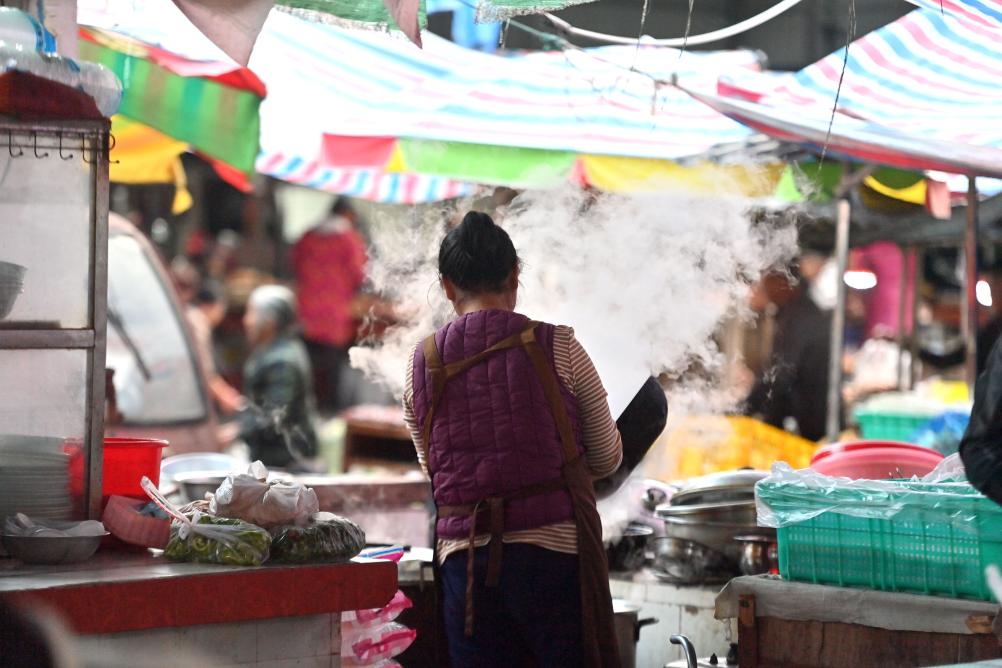 在柳州市柳江區成團鎮農貿市場早市,人們在吃早餐(11月19日攝)。