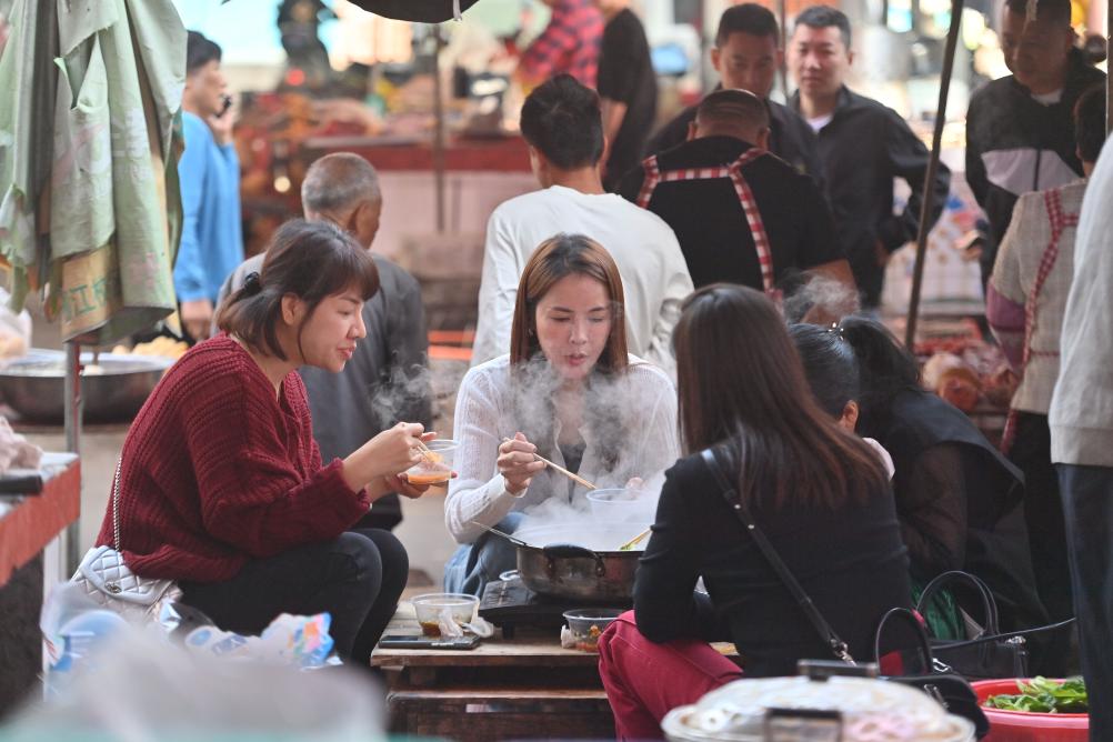 在柳州市柳江區成團鎮農貿市場早市,來自浙江省杭州市的游客張辰(右一)在吃早餐(11月20日攝)。